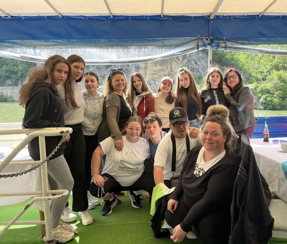 По завршетку ручка, уследила је двосатна вожња бродом по Ђердапској клисури током које су се ученици и њихове одељењске старешине одлично забављали. Сви су били одушевљени импозантном статуом Децебала, уклесаном у стенама. Децебал је био последњи владар Дачана, народа који се сматра прецима данашњих Румуна. Због своје дуготрајне, упорне и већим делом успешне борбе против освајача, Децебал је добио статус националног хероја. Са брода се још могла видети чувена Трајанова табла, из периода похода римског цара Трајана на Дачане (100-103. године). У самој клисури Казан велику пажњу је привукао манастир Мраконија, смештен на румунској страни Дунава. Последње место обиласка било је мезолитски и неолитски локалитет Лепенски вир. Прво су ученици одгледали петнаестоминутни документарни филм о ископавањима професора Драгослава Срејовића која су започета 1965. године, а онда разгледали ово праисторијско насеље са траговима огњишта и каменим скулптурама унутар сваке куће које су постојале. Са ове незаборавне екскурзије сви су понели сјајне утиске, прегршт фотографија и наравно, прелепе сувенире. Била је то још једна прилика да се ученици обе школе друже и јачају пријатељство. |