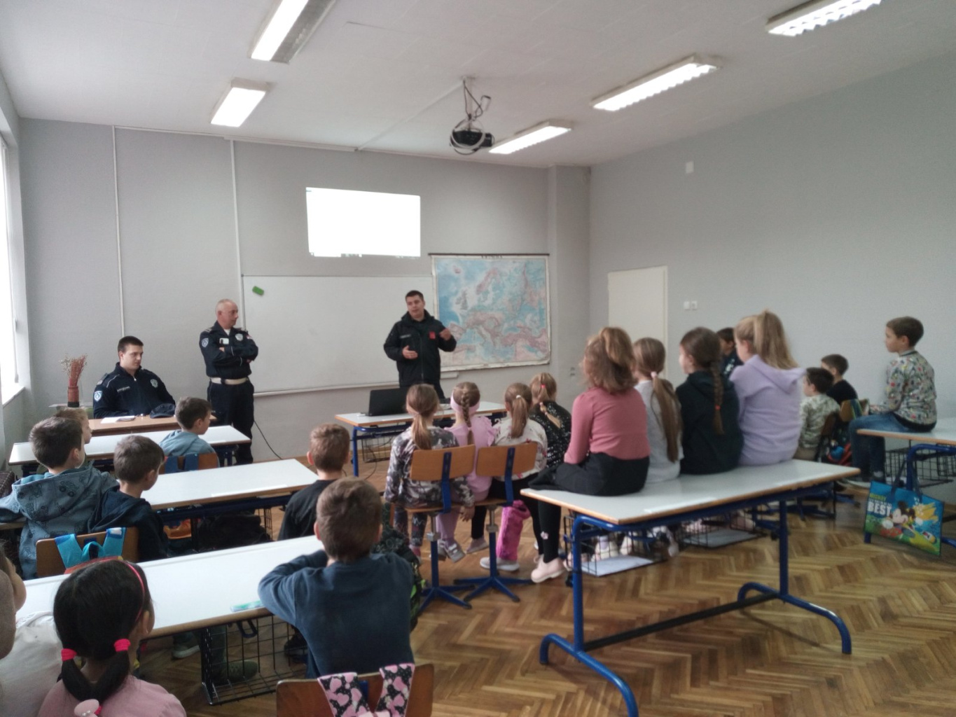 У уторак 28. октобра представници Министарства унутрашњих послова и Ватрогасне службе посетили су нашу школу и одржали предавање на тему „Превенција вршњачког насиља у стварном и виртуелном окружењу” за ученике првог, другог, петог и осмог разреда. Радионица је одржана у оквиру пројекта „Заједно и безбедно кроз детињство” са циљем да се ученици упознају са основним начелима безбедности, како у реалном свету, тако и на интернету. Ученици су на предавању сазнали како да препознају насиље и дискриминацију, како да сачувају личне податке од нежељених посматрача, како да одреагују на насиље и коме се у непожељним ситуацијама могу обратити. На крају предавања ученици су имали прилике да покажу своје знање решавањем теста. Млађим разредима одржано је предавање о поступању у случају ванредних ситуација, као што су: пожар, поплава, земљотрес, а ученици су од ватрогасца научили како да правилно реагују и поступе у случају да се нађу у непожељној ситуацији. Овим путем ученици су упознати са основама безбедности, а следећа едукативна радионица биће посвећена упознавању ученика осмог разреда са полицијском професијом и одржаће се у току другог полугодишта. Песма СЕМАФОР у изведби наших најмлађих ученика
