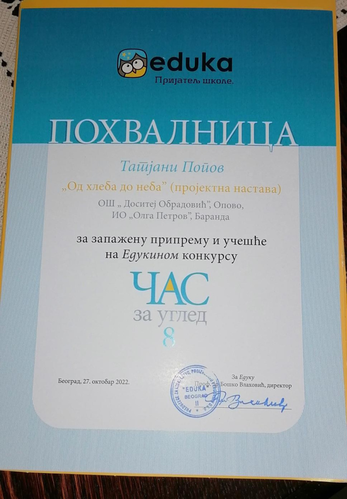 Прошле школске године 2022/2023. за Зборник иновативних радова одабран је и рад учитељице Татјане Попов, „Од хлеба до неба“ – пројектна настава у трећем разреду.